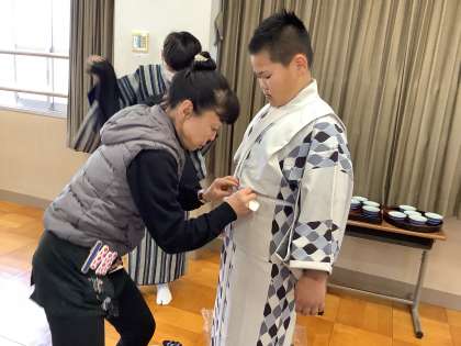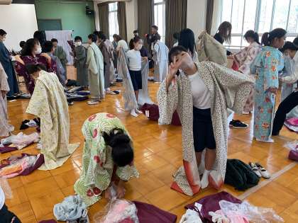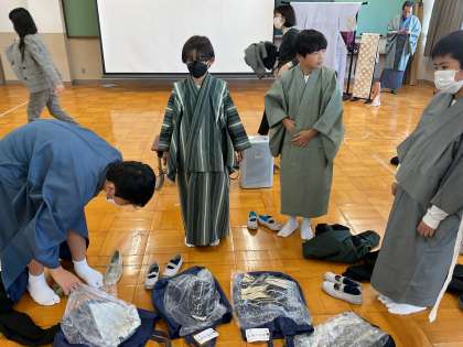 初めて着物を着るという人も多く、ドキドキワクワクしながら体験学習に取り組みました。