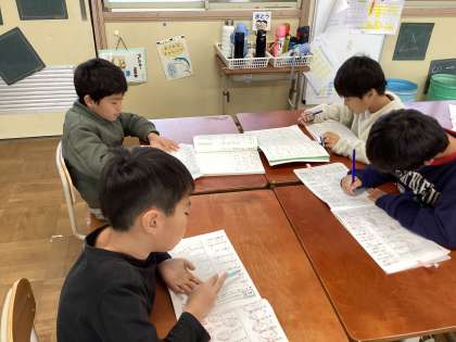 2年生で習う漢字はすべて終わりました。今日は、プリントで習った漢字を復習しました。友だちと教え合いながら、復習を進めています。
