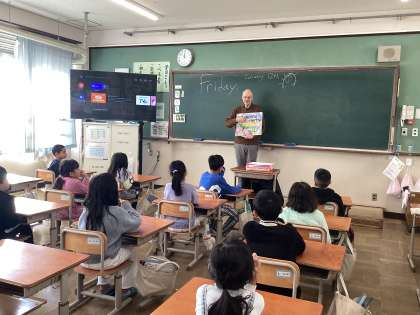 1年生が大好きなポール先生と一緒に学習しました。自分で塗ったちょうちょうを、英語で紹介しました。