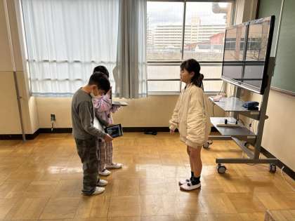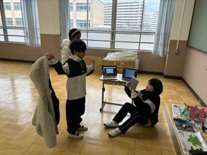 藤の木小のじまんを考え、他校に紹介する活動をしています。色々ないいところを見つけて詳しく紹介する方法を考えました。