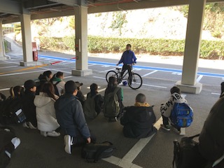 関西サイクルスポーツセンターに到着しました。みんな元気です。自転車の乗り方について教えてもらいました。今からグループ行動で、色々まわります。