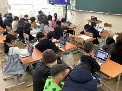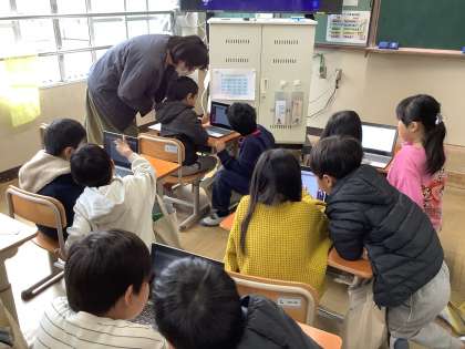 1年生の学活の時間に2年生が教えに来てくれました。GIGA端末を使うのに慣れていない1年生は2年生に教えてもらいました。学校評価アンケートや「Yomokka!」などを使えるように練習しました。