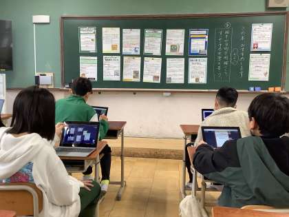国語の「この本、おすすめします」の学習では、相手と目的を明確にして紹介文を書きました。書き上げた紹介文を読み合っています。