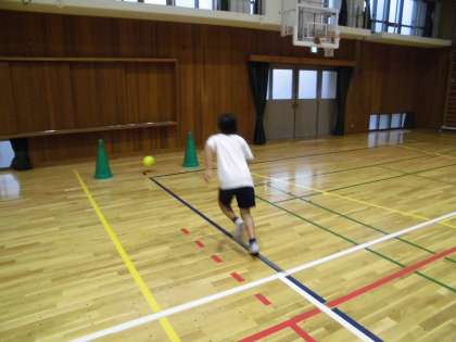 体育の学習では、ボールを使って的あてに挑戦しました。輪っかの中にボールを当てると次の的に進み、難易度がアップします。何度も挑戦していました。サッカーのようなコーンとコーンの間にボールを蹴る練習もしました。