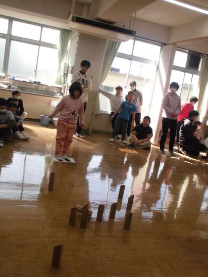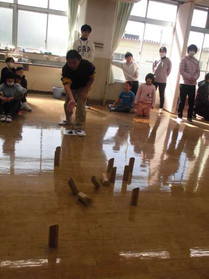 中学生が企画してくれたツリレーやフィンランド発祥のモルックというスポーツを楽しみました。モルックは数字の書かれたスキットルを倒して,50点ピッタリを先取するゲームです。