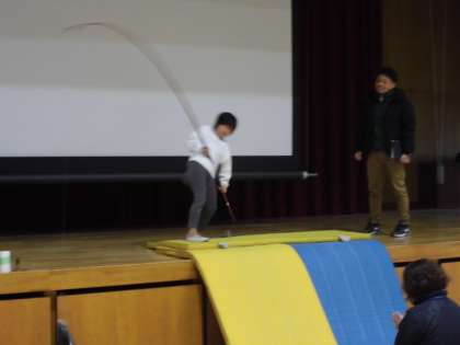 たてわり班でおさかなフェスティバルをまわりました。6つのブースがあり、時間ごとに体験させていただきました。鰹の一本釣りやカツオの削り節体験、本物のお魚を触る機会がありました。