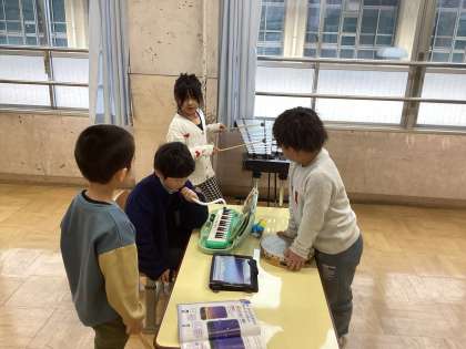 星空の様子に合わせて、音楽作りをしました。楽器の種類や数を考えたり、音の大きさやスピードを変えたり、自分たち様々な工夫を考えることができました。