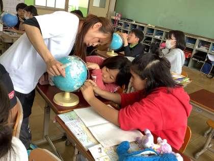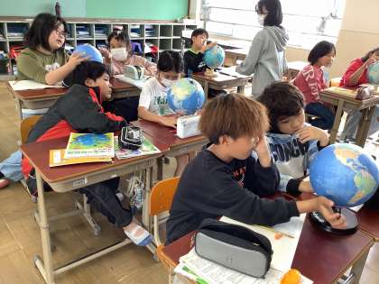 5年生の社会科「世界の中の国土」の学習では、地球儀も使って国土について学んでいます。