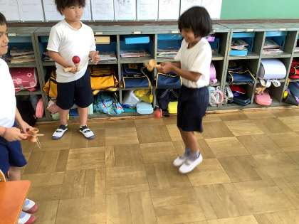 2年生の藤の木タイムでは、計画を立てて、過ごしています。今回はけん玉やカルタなどで過ごしました。けん玉を初めて挑戦する友だちにも教えていました。