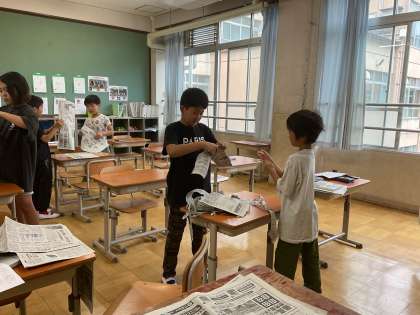 新聞を高く積むというミッションに班で話し合いながら工夫をし、挑戦しました。
