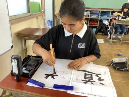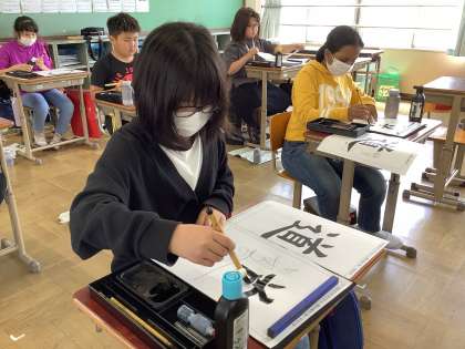5年生は、中と外の部分の組み立て方と、穂先の動きに気をつけて、「道」の文字に挑戦しました。