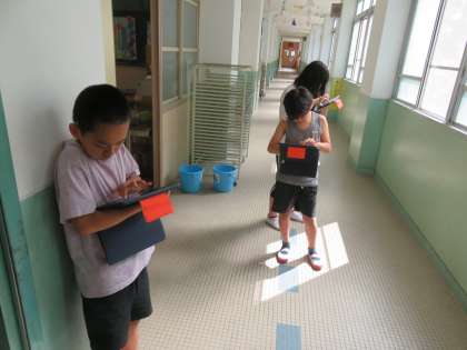 タブレットで学校の中の写真を撮り、それを校舎の地図に貼り付けて、わかりやすい校舎配置図を作りました。