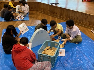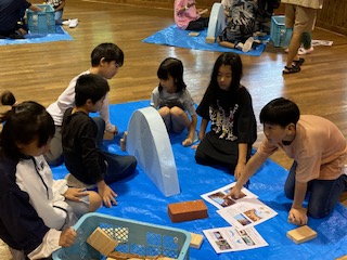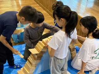 悪天候のため、雨用プログラムのアーチ作りに班で協力して挑戦しています。