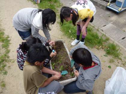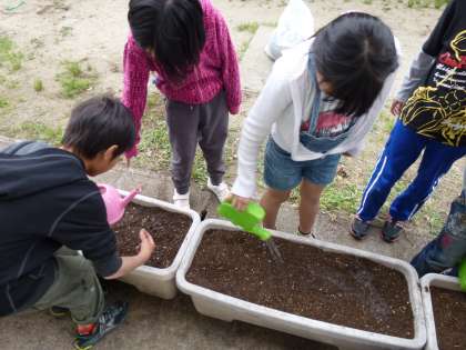 今日は,みんなで大きなプランターに土を入れ,ツルレイシの種をまきました。