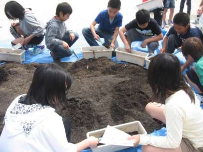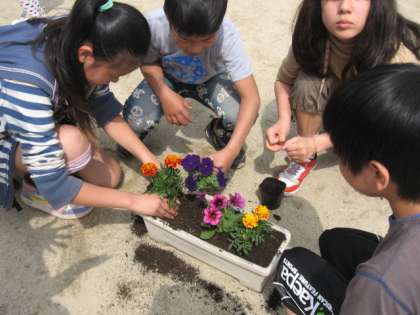 よいお天気のもと,たてわりグループの友達と花を植えました。優しい高学年のお兄さん・お姉さんがいろいろと教えてくれました。花植えのあとはグループで遊びました。今日が今年度初めてのたてわり活動でした。少し緊張した様子もありましたが,