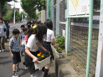 門の外にはきれいな花のプランターが並びました。2年生は火曜日が水やりの担当です。忘れずに水をあげましょう!