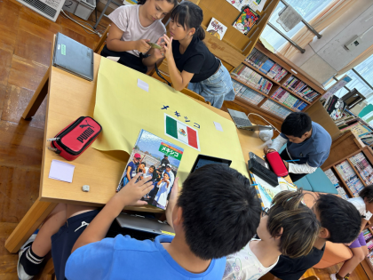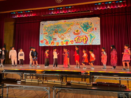 2学期は世界の国についてスピーチをしました。そして、ふじフェスでは調べたことを使って、世界の国を劇で紹介しました。練習でも、動画を見てふりかえりながら本番に向けて頑張っていました。