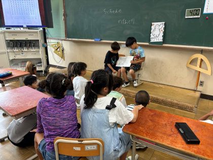 4年生が3年生に話し合いの仕方を教えたり、3年生が作った文章を4年生に校正してもらったりしました。3年生はキャッチコピーを考えてふじフェスのポスターを作り、保育園に持って行きました。2学期の最後には、2年生が生活科で作ったおもちゃを紹介する文章にも書きました。