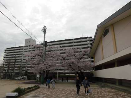 校門の桜が綺麗に咲き誇る中、