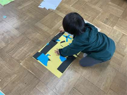 今日の図工では、色画用紙を破いて、形を作りました。