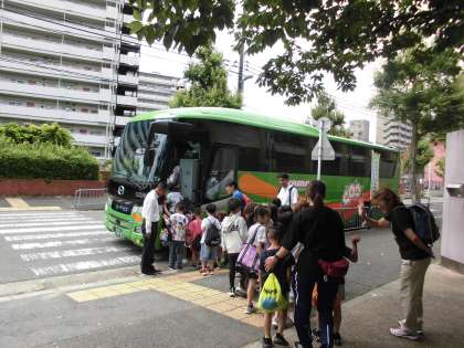 子どもたちは、観光バスに乗って