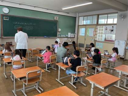 1年生がタブレットに向かって何やら一生懸命練習しています。