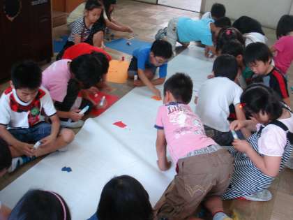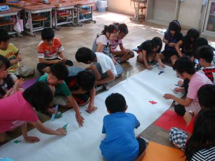 今日は、舞台につるす大きな看板作りをみんなでしました。鉛筆で薄く書いてある文字に、色画用紙をちぎっては貼り、ちぎっては貼り、ちぎっては貼り、ちぎっては・・・・・子どもたちの集中力で予定していたよりも早く、そしてすてきな看板ができあがりました。