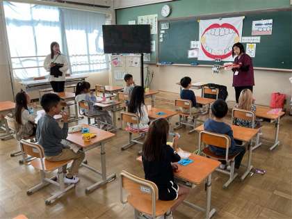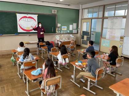 歯科衛生士さんに来ていただき、歯の大切さや正しい歯みがきの仕方について教えてもらいました。学んだことを生かして、毎日しっかりみがいてほしいと思います。