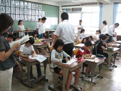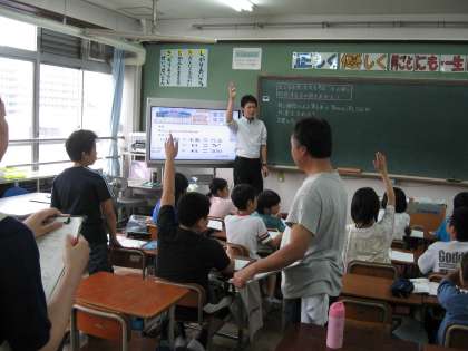 向島東中学校の数学の先生と一緒に授業を行っている様子を中学校の先生や向島小学校の先生も見に来て下さいました。