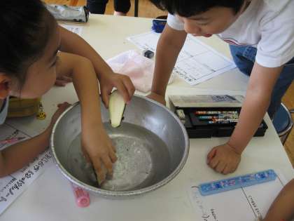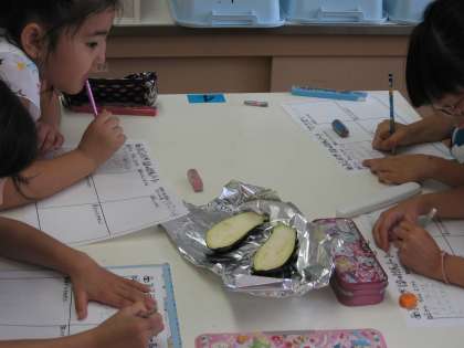 「半分に切ったら」「水につけたら」「油でいためたら」「食べてみたら」など,子どもたちはいろんなことを発見していました。