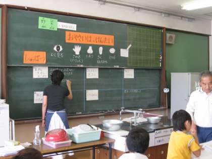 2年生は,栄養士の堀井先生から,自分たちで育てたナスを使い,食について教えてもらいました。