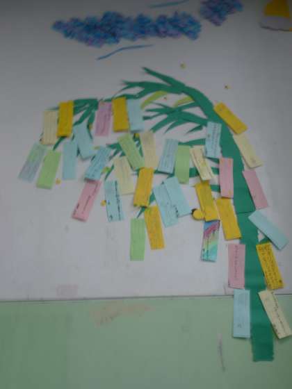 短冊には,算数が得意になりますようにやサッカー選手になれますように,家族が長生きできますようになど子どもたちのたくさんの思いがつまっていました。
