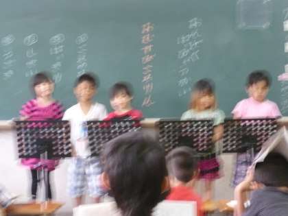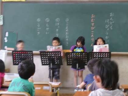 毎日学校でも,家でも宿題で練習してきた「おむすびころりん」を,クラスみんなの前で班ごとに発表しました。