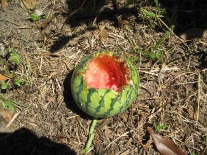 みんなで楽しみにしていたスイカが観察に行くと,なんとたくさんのアリや虫に食われて,ご覧の通り大きな穴が開いてしまいました。それも3個も食べられてしまいとっても悲しい気持ちになりました。