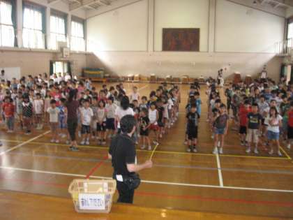 5年生からエコキャップの取り組みの紹介,校長先生から夏休みにしか出来ないようなことに挑戦して楽しもうというお話,和谷先生から安全についてのお話がありました。
