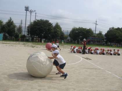 運動会で踊る花笠音頭のふりが少しずつできるようになってきています。今日は2時間連続で運動会練習でした。今日は初めて大玉ころがし「ころりんピック」の練習をしました。大きな玉は思うようには転がってくれず,悪戦苦闘の1年生。時には大玉と一緒に転がってしまいそうな場面も・・・!それでも2人で力を合わせて次の人に大玉をパスします。2年生と協力して,勝利を目指します!頑張れー!