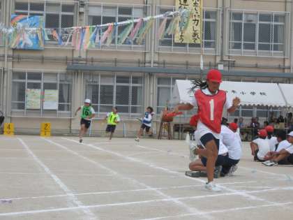 プログラム14.と 21.高学年による「色別対抗リレー」です。