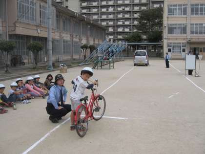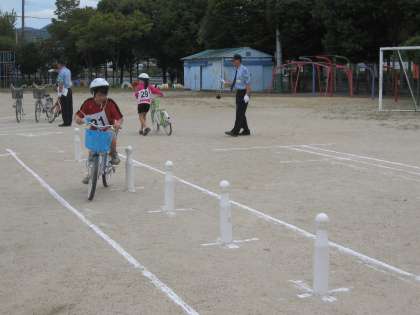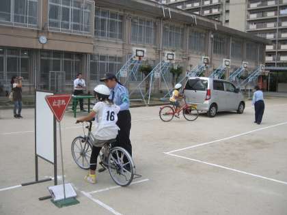実技テストでは,信号のある交差点の曲がり方,止まっている自動車のよけ方などを教わりました。一度練習をしてから,テストにのぞみました。