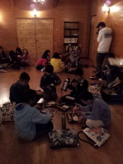 百井キャンプ場にも雨が降ってきたので、昼食が室内になりました。