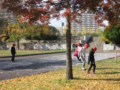 生活科の学習で東公園に秋を探しに行きました。東公園の木の葉はすっかり紅葉していてとてもきれいでした。夏に来た時とはすっかり景色がかわっていました。子どもたちはどんぐりや落ち葉,木の実など様々な秋をみつけて集めていました。次は丸町公園に行く予定です。