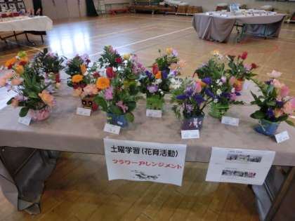 土曜学習で作ったフラワーアレンジメントを図工展でかざりました。