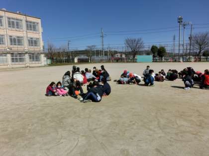午前10時30分(中間休み時間)に訓練用の地震緊急速報が入りました。子どもたちは運動場や図書室など自分のいる場所でそれぞれが身の安全を守る行動を実践していました。