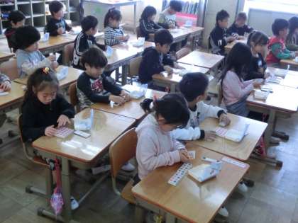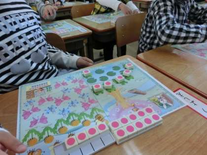 カエルやチョウなどの絵に,1つずつブロックを置いていきます。