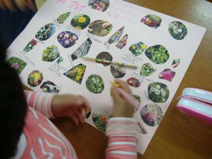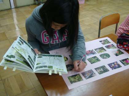 運動場や中庭、校区の公園などで見つけた花の名前を図鑑を使って調べました。