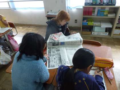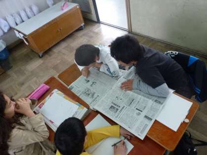 国語で「新聞を読もう」の学習をしています。多くの子が普段,新聞はほとんど読まないということでしたが,この学習では,新聞の特長や効果的な写真や記事の載せ方について学習します。今日は実際の新聞から,書き方の特長や工夫などをグループで話し合いながら見つけました。