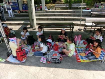クイズラリーを終え、花の広場で昼食をとりました。移動やクイズラリーを終えて空腹のみんなは、にぎやかに昼食の時間を過ごしました。おかずを交換する姿も多く見られ、笑顔でお弁当を食べていました。