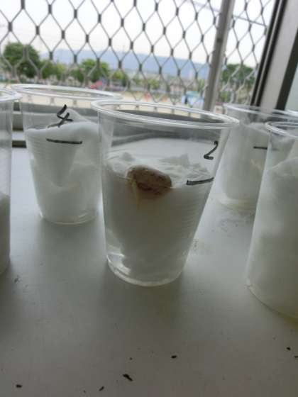 理科の学習でインゲン豆を使って発芽の実験をしています。今は「発芽に水は必要か?」ということを調べるために実験中です。変化の様子に興味深々です。