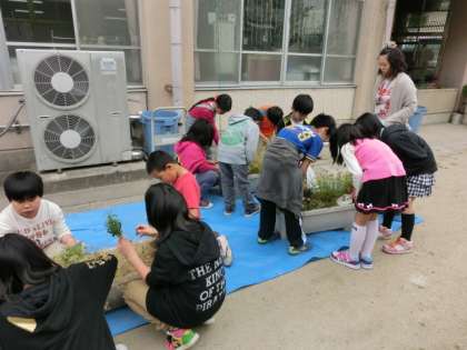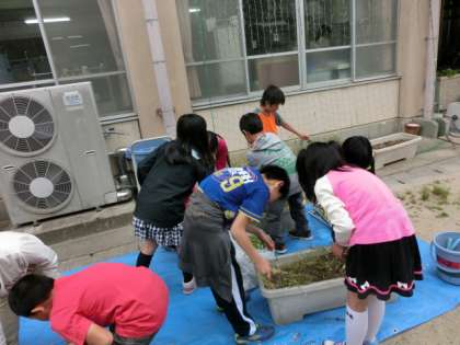 今日は今後の学習で使うアサガオやツルレイシの準備をしました。プランターの土をたがやし,種をまきました。
