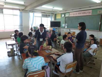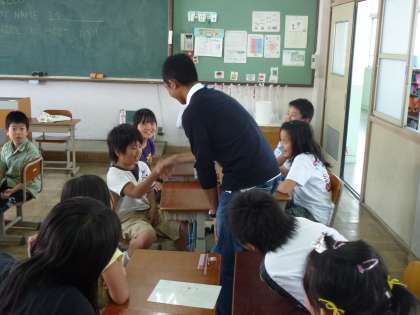 5,6年生に英語で,あいさつなどコミュニケーションの取り方を教えて下さいました。