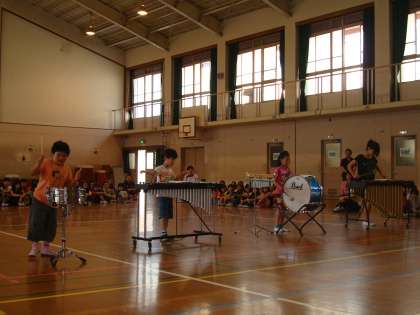 14日に行われたお迎え集会。4組の出し物は、大太鼓・小太鼓・鉄琴・木琴で「ドレミの歌」を合奏しました。